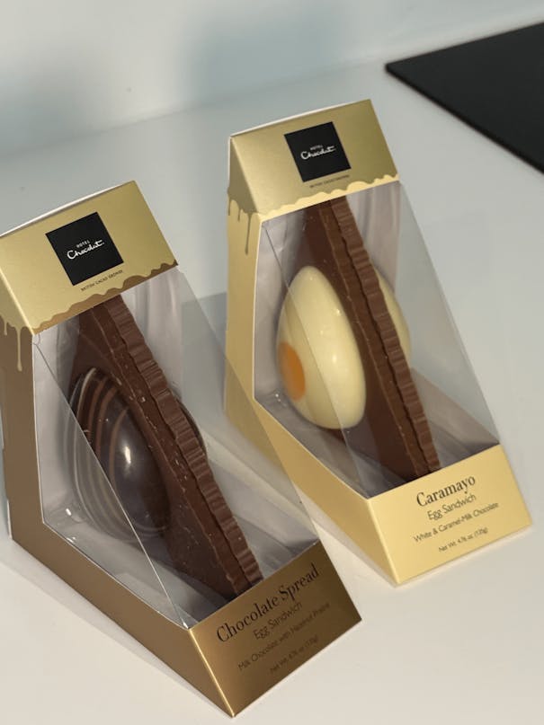 These fancy little creations are novelty Easter chocolates designed to look like a sandwich, complete with chocolate “bread”.